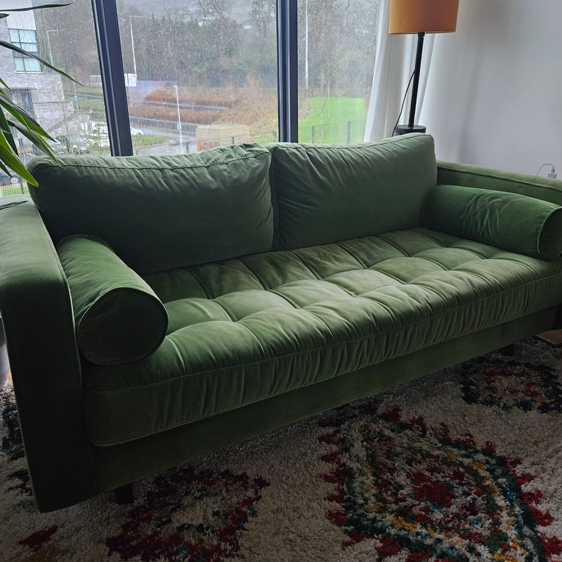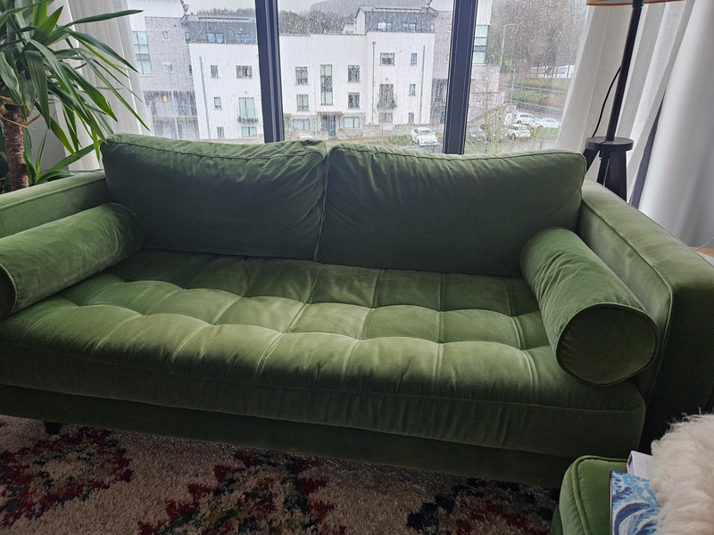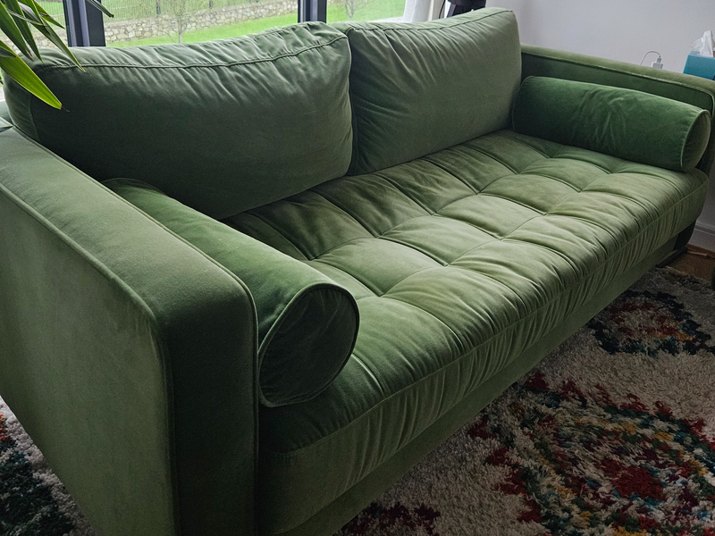 Lovely EZLiving Scott 2 Seater Couch Green velvet with 2 bolster cushions Bought Aug 2024 for €1300 Width: 180cm Depth: 97cm Height: 83cm Seat Height: 44cm Arm Height: 69cm