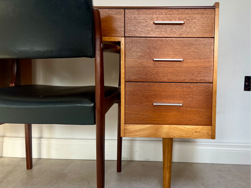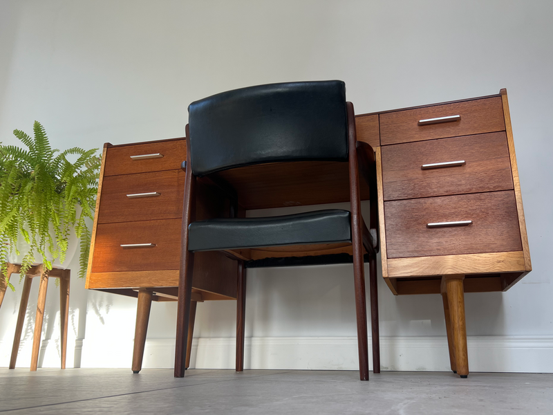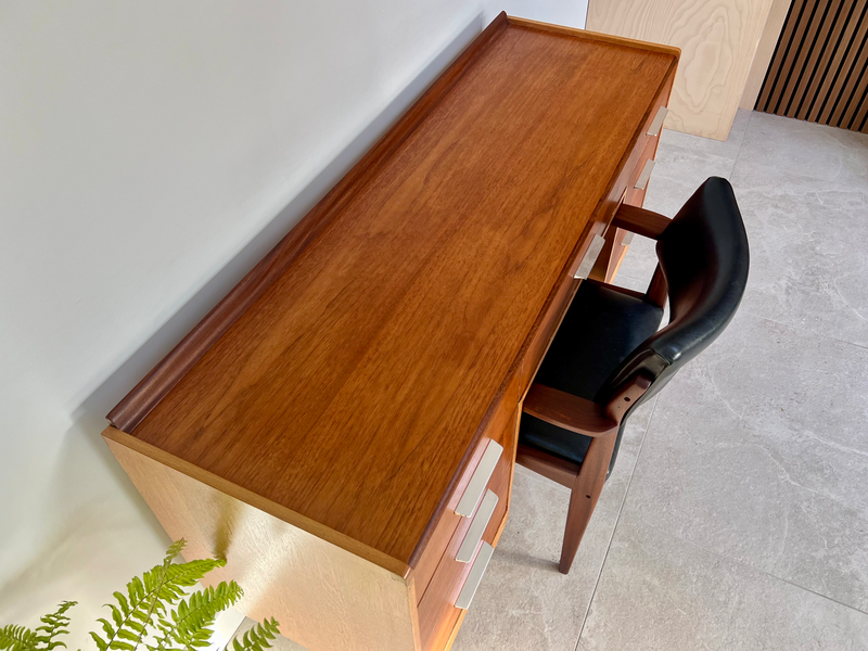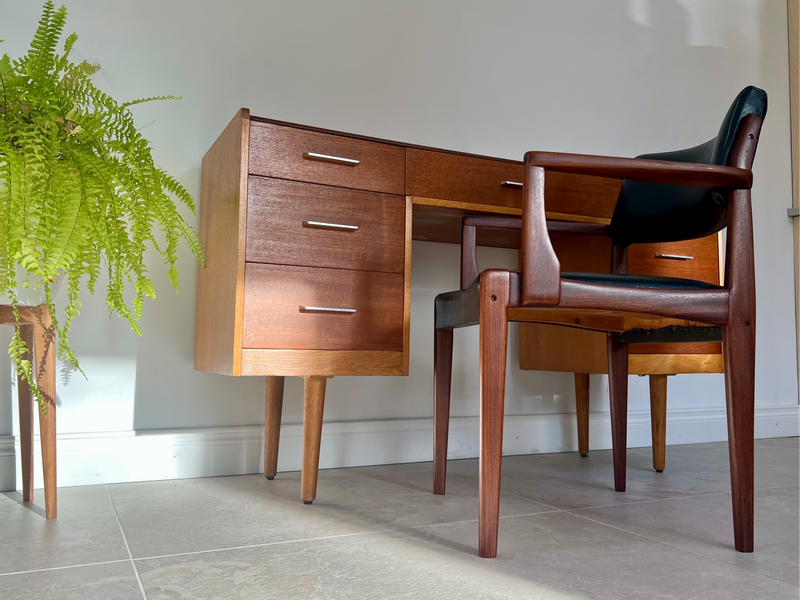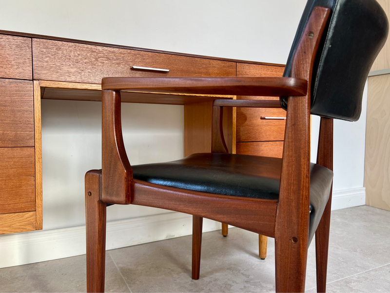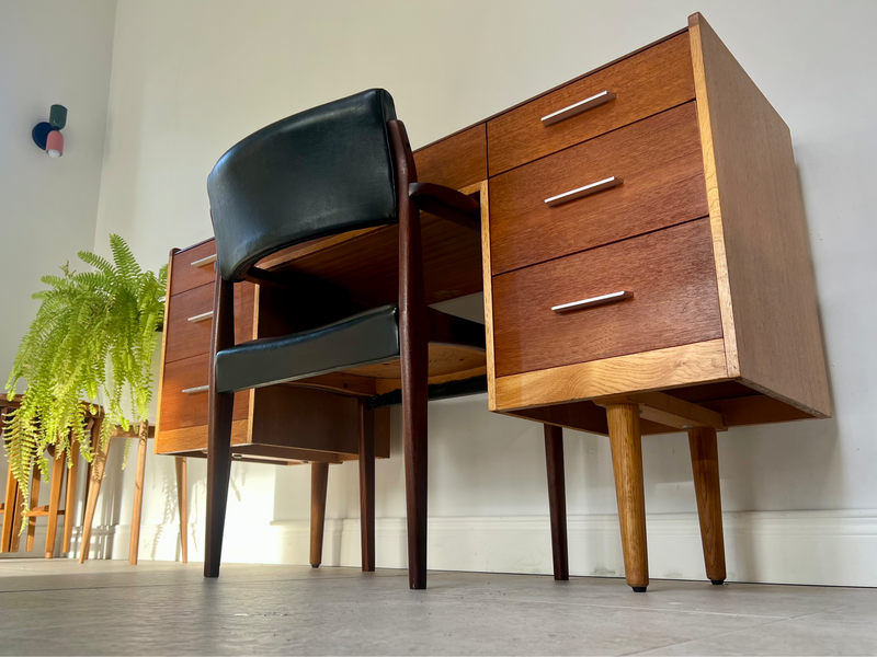 All Ireland delivery available//viewing welcome Belfast. Dimensions H - 78cm W - 133cm D- 43cm. Presented in refinished condition, an outstanding and very difficult combination of desk and chair in relatively compact dimensions, suitable for most spaces. Designed by John & Sylvia Reid circa late 1950, constructed from teak and quartersawn oak which gives a very welcoming contrast//finished with aluminium finger pull handles. Solid teak and black leather chair slots into knee hole perfectly