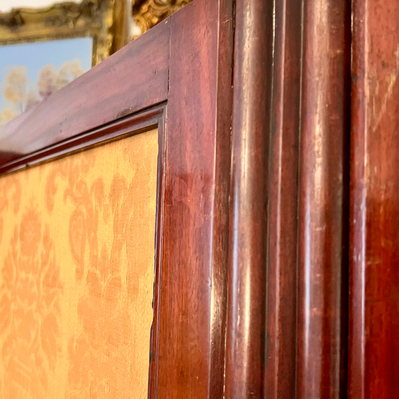 Stunning antique threefold screen, room divider (or wall panel) with gold damask fabric panels.Beautifully engineered folding mechanism. Brass fittings(top, middle, bottom) allow it to be folded in all directions.Possibly mahogany or rosewood, consistent with Victorian or William IV period styles. There are couple of marks on the fabric, nothing too bad.No tear on the fabric, wear on the wood consistent with age.This is a really heavy piece, doesn’t wobble. H 183cm, W 187,5cm,folded 62,5cm