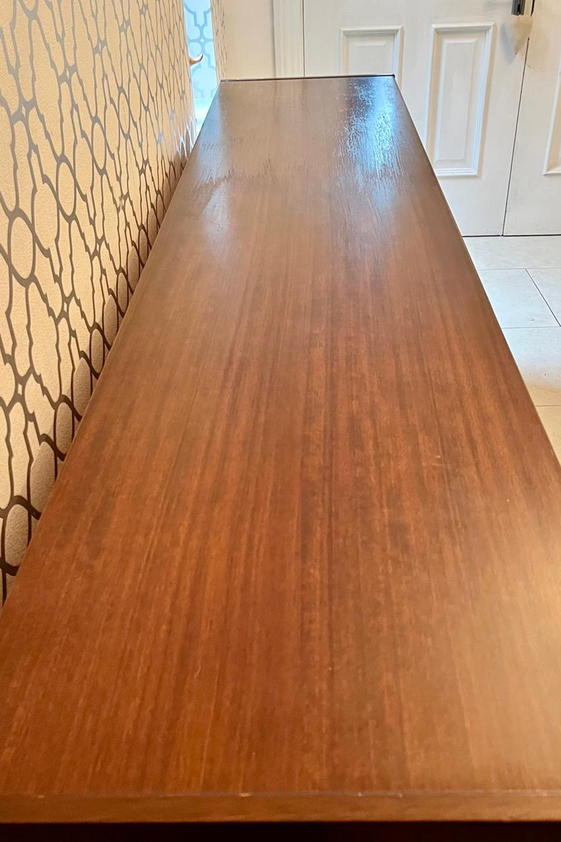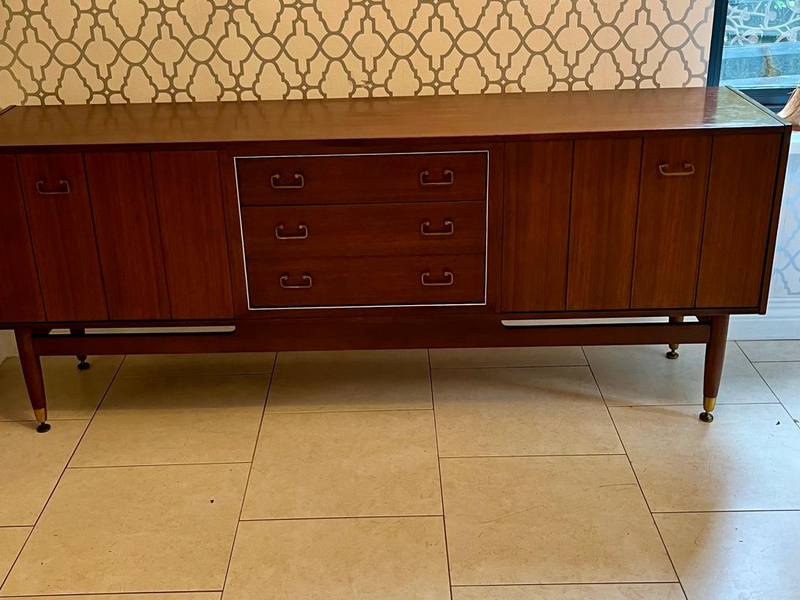 Production Period 1960 to 1969 Country of Manufacture United Kingdom Style Mid-Century Detailed Condition excellent considering it’s vintage Materials Brass, Teak Color Brown Width 156 cm Depth 43 cm Height 73 cm
