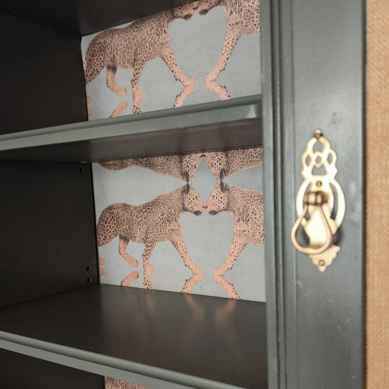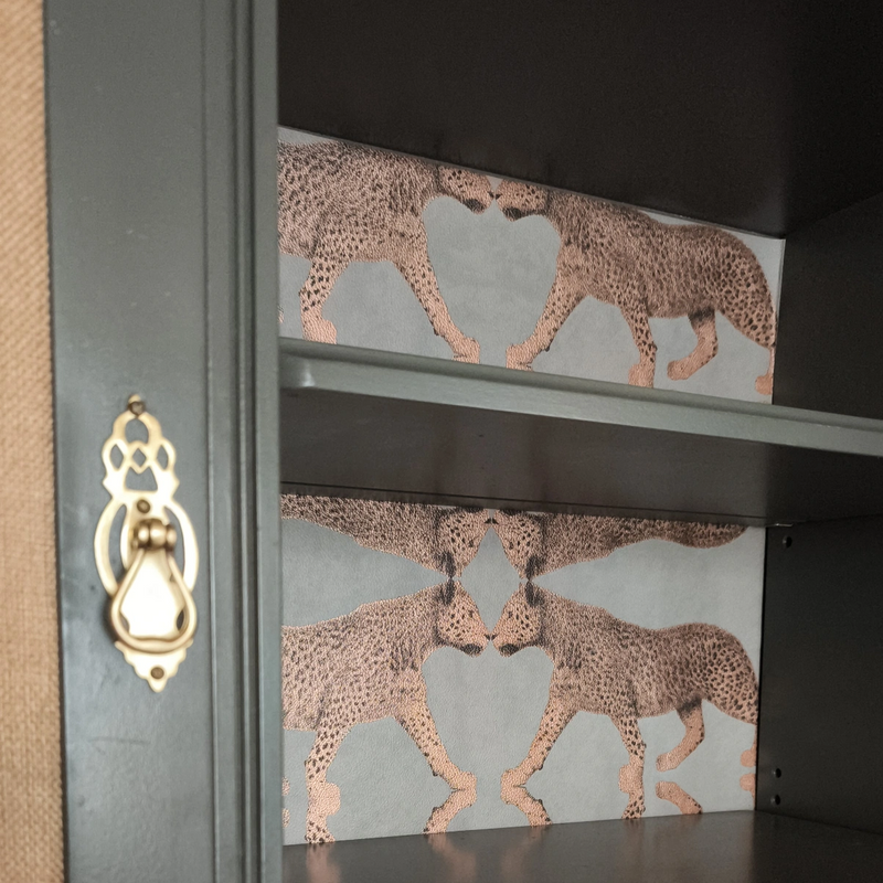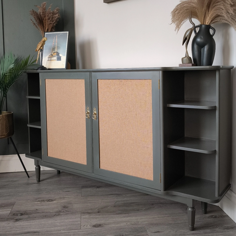 Beautiful bespoke Console Table. Refurbished in a custom green paint. Sealed for durability. Hessian detailed doors with stylish liner inside the unit. Dimensions: 85cms height. 1520cms width 30cms depth
