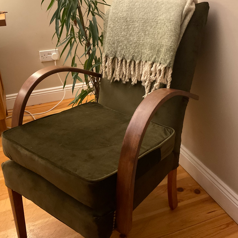 this is a really comfortable mid century vintage bentwood chair in a deep green velvet material and in great condition Seat depth 19” Seat height 19”