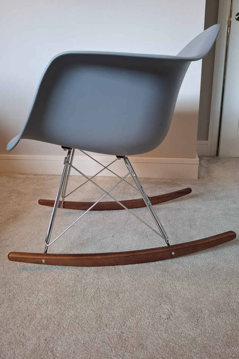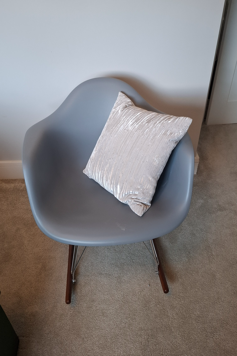 Grey rocking chair with wooden base legs. Height 70cm Width 62cm. Perfect for a baby nursery.